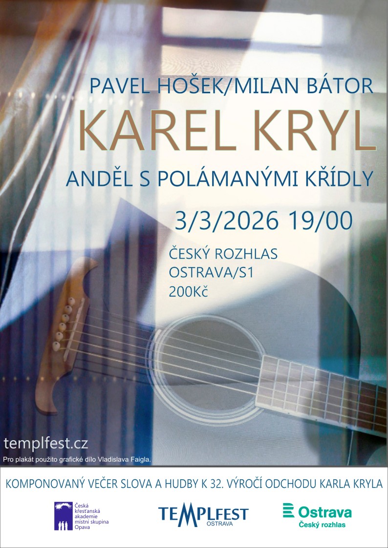V rámci komponovaného večera vystoupí spisovatel, religionista a teolog Pavel Hošek autor knihy „Jako anděl s lámanými křídly – duchovní profil Karla Kryla“ za hudebního doprovodu renomovaného kytaristy, hudebního publicisty a pedagoga Milana Bátora.